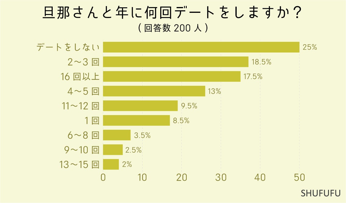 旦那さんと年に何回デートをしますか?の問いに対して最も多かったのが「デートをしない(25%)」でした。 次いで「2〜3回(18.5%)」「16回以上(17.5%)」という結果でした。 4人に1人は旦那さんとデートしないという結果でした。夫婦によってデートをする人としない人で分かれるようです。