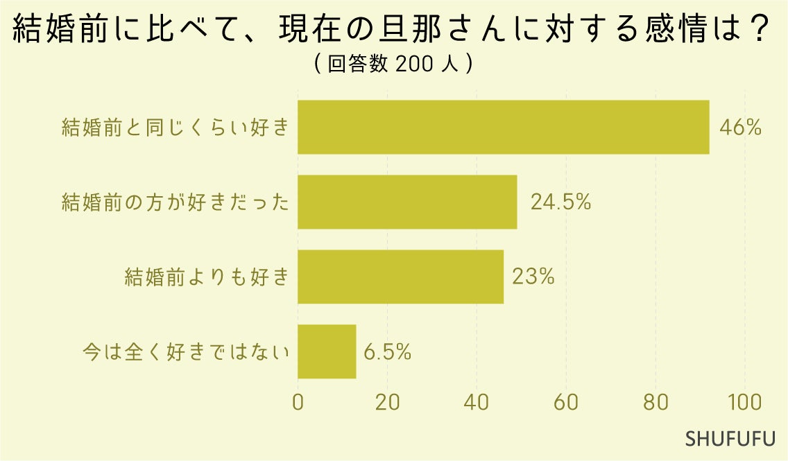 結婚前に比べて、現在の旦那さんに対する感情を尋ねたところ、1位は「結婚前と同じくらい好き(46%)」、2位「結婚前の方が好きだった(24.5%)」となりました。世の中には仲が悪くなってしまった夫婦より、変わらず仲良しな夫婦の方が多いのかもしれませんね。