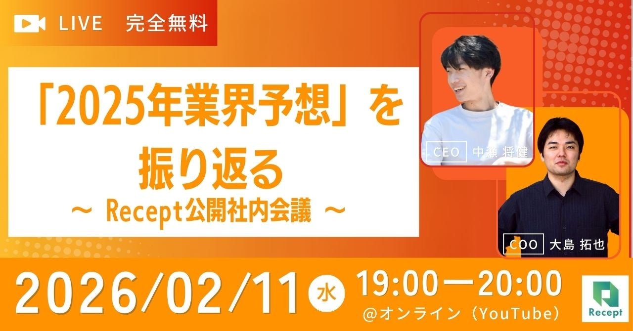 株式会社Recept(本社:東京都千代田区、代表取締役CEO:中瀬 将健)は、2026年2月11日(水)19:00より、オンラインウェビナー「DID/VCウェビナー『2025年業界予想』を振り返る ~ Recept公開社内会議 ~」を無料開催いたします。