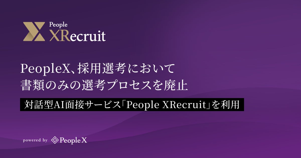 採用から活躍支援まで、AIで人事課題を解決する株式会社PeopleX(本社:東京都新宿区、代表取締役 CEO:橘 大地、以下:当社)は、当社の採用選考において、当社が提供する対話型AI面接サービス「People XRrecruit(ピープル・クロスリクルート)」の利用を開始したことをお知らせいたします。これにより書類のみで採否を判断する過程をなくし、書類と面接(AI面接)の内容を総合的に考慮することとすることで、これまで以上に、人権をより尊重した、適性・能力に基づく選考に努めてまいります。