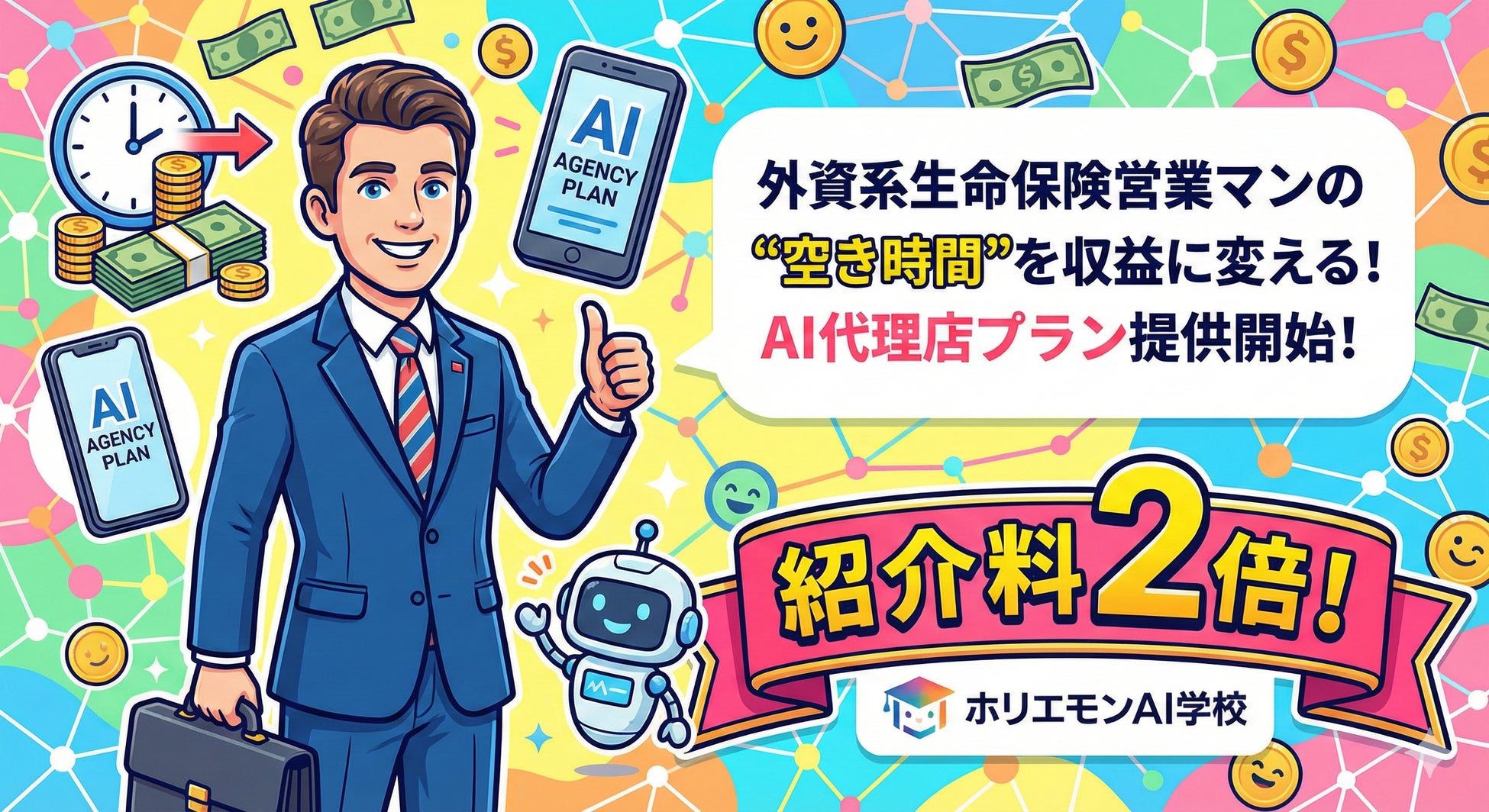 ホリエモンAI学校株式会社(本社:東京都新宿区、代表取締役CEO:荒木 賢二郎、以下「ホリエモンAI学校」)は、実施中の紹介パートナープログラムにおきまして、「外資系生命保険営業マンの“空き時間”」を収益に変える、外資系生命保険営業マン特別プランを発表いたします。紹介料を従来の10%から20%に期間限定で増額し、なぜか時間が空いてしまった外資系保険営業マンを支援します。