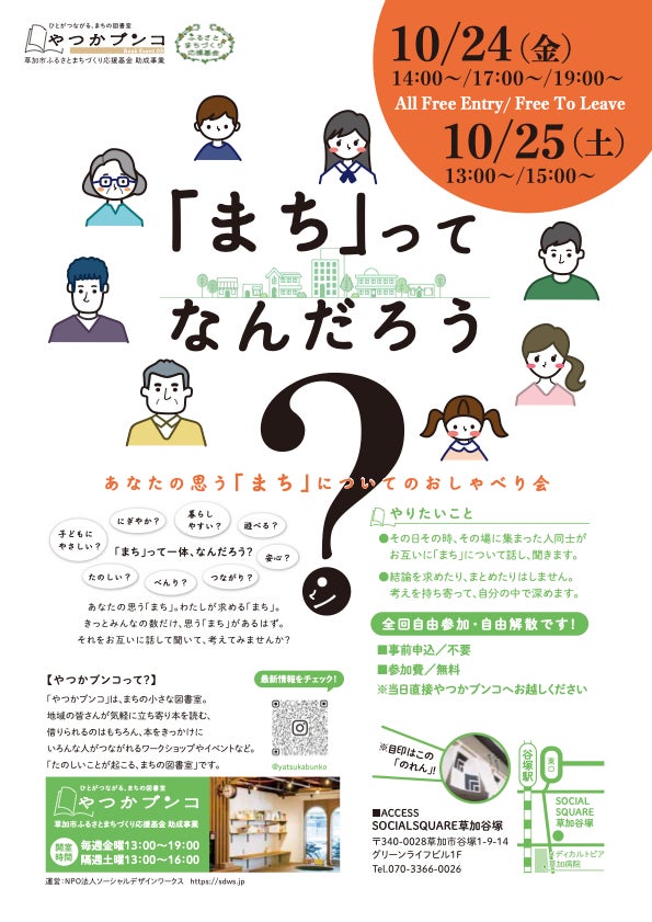 10/24(金)、25(土)にソーシャルスクエア草加谷塚店(運営法人:NPO法人ソーシャルデザインワークス 代表理事:北山剛)内のやつかブンコにて、「『まち』ってなんだろう?-あなたの思うまちについてのおしゃべり会-」が開催されます。まちと聞いた時にあなたなら何を考えますか?きっと色々な『まち』のイメージがあるはず。