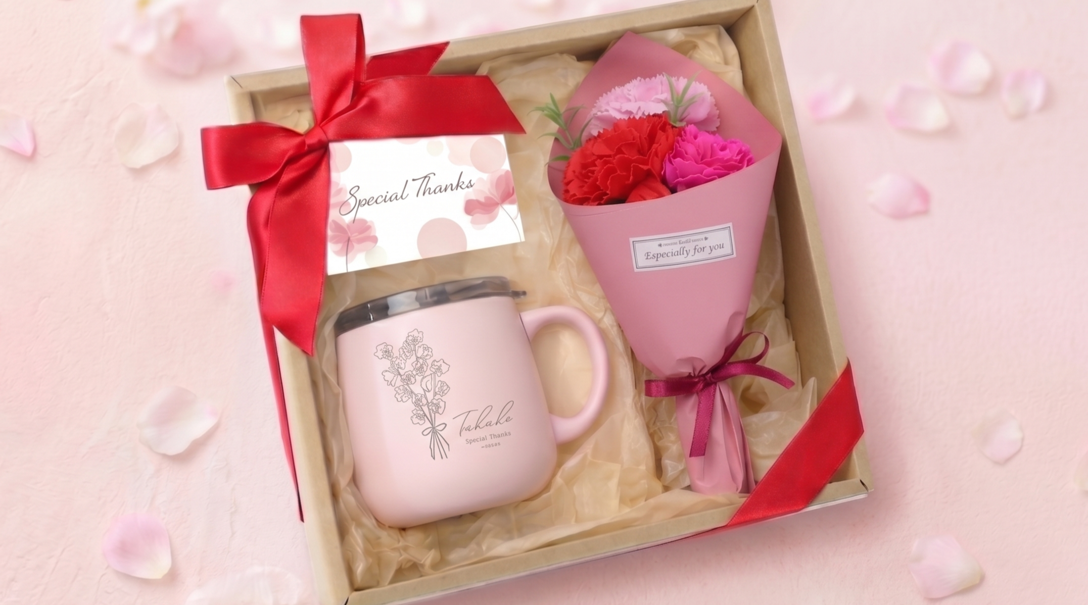 名入れができる真空断熱マグカップと、枯れないソープフラワーのミニブーケをセットにしたギフトボックス商品です。