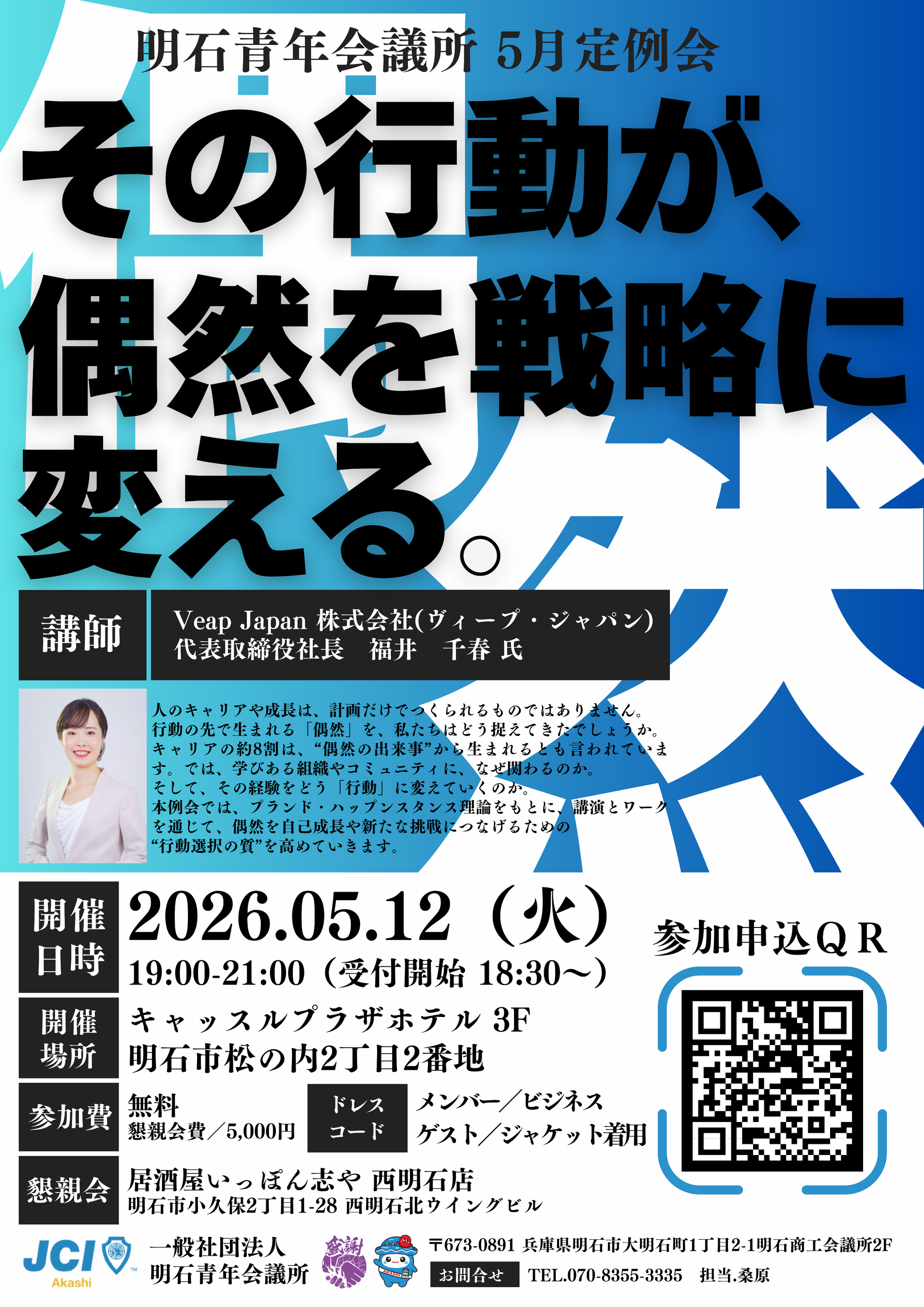 一般社団法人明石青年会議所(理事長:永井 健太、所在地:兵庫県明石市大明石町1丁目2-1 明石商工会議所2F)は、2026年5月12日(火)、キャッスルプラザホテル3Fにて、実践型事業「その行動が、偶然を戦略に変える。」を開催いたします。講師には、Veap Japan 株式会社(ヴィープ・ジャパン)代表取締役社長 福井千春氏を迎え、プランド・ハップンスタンス理論をもとに、学びや出会いをどのように自己成長や新たな挑戦につなげていくかを考えます。
