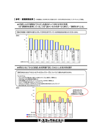 近年、顕著となる女性の社会進出を背景に、就労意識や就労状態も多様化する中で、女性が抱えるストレスや悩みに注目が集まっております。一方、食では健康志向の多様化を背景に、その素材本来に含まれる栄養をとりいれよう、という、ナチュラル志向、素材志向の考え方が改めて見直されています。また、「病は気から」という言葉の通り、ココロの健康はからだの健康と密接に結びついており、特に、女性は特有のサイクルによって、からだとココロのバランスが変わりやすいといわれております。エースコックが09年2月に実施した意識調査では、女性の9割以上が月経に関わる「からだ」と「ココロ」に変化や不調を感じていることがわかりました。「からだ食堂」は、その変化とメカニズムに着目し、女性の前向きな生活を応援するために開発しました。