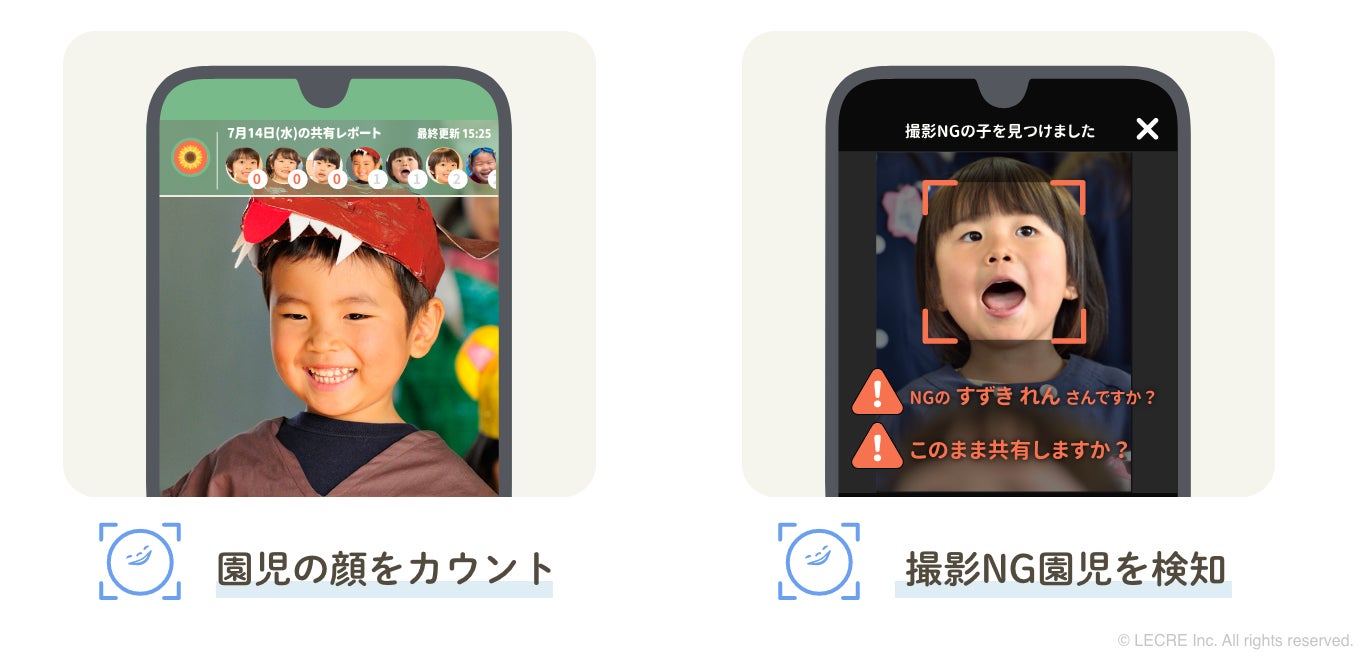 『せんせいみて!』には、マスクを着用していても94.1%見つけることができる独自の顔認識「うちの子AI」が搭載されています。AIが園児ごとの共有回数をカウントするので、写真や動画を偏りなく共有することができます。また、撮影NGの園児をAIが自動で検知。写真や動画を公開する前に気づくことができるので、安心です。