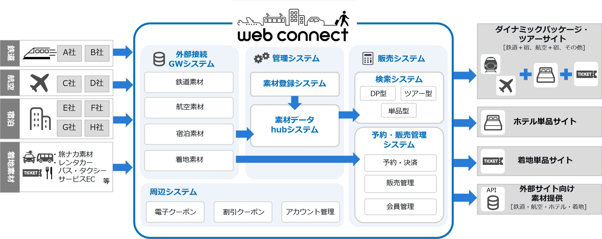 webコネクトは、2020年4月より大手航空2社によって導入された新IIT運賃に対応した販売プラットフォームとしてスタートしました。ダイナミックプライス型旅行商品のリアルタイムな料金計算と高速な一覧表示を実現しています。また、旅行業界の構造改革に伴う各社の課題を解決するため、サービス基盤を共通化し、必要な機能のみをSaaS提供するというコンセプトで、機能拡張を重ねています。
