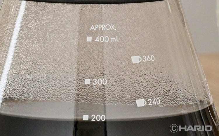 サーバーにはあえて取っ手を付けず、収納時は省スペースに。さらに240mL・360mLの目安ラインがあるので、このラインで水を計ってからケトル等に移し沸かすと便利です。
