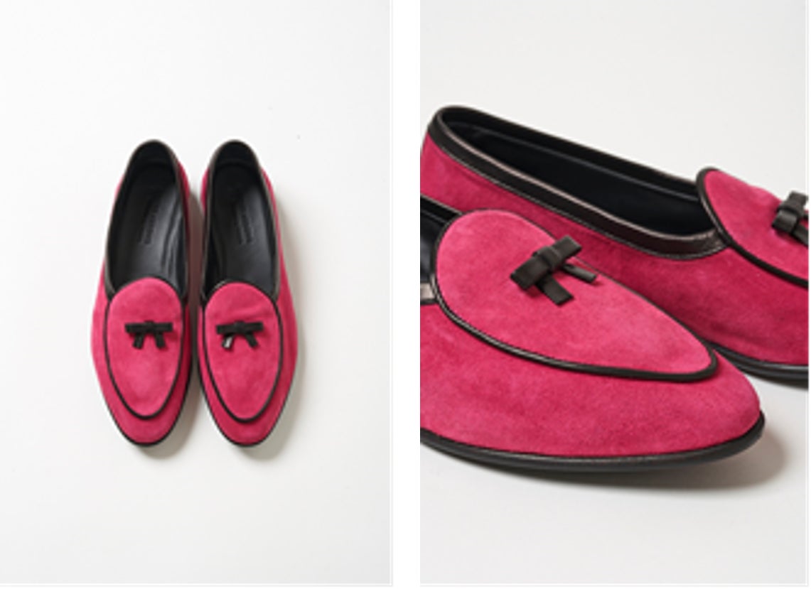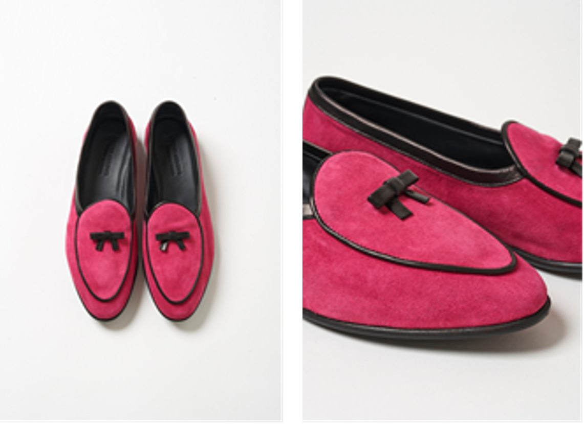 テーマカラーであるピンクでベルジャンシューズを別注オーダーしました。象徴的なブラックのリボンとパイピングのディテールに、深みのあるピンクの色合いがマッチした一足。今シーズンはカラーボトムスと合わせて、色×色の今までとは一味違うスタイリングがおすすめです。