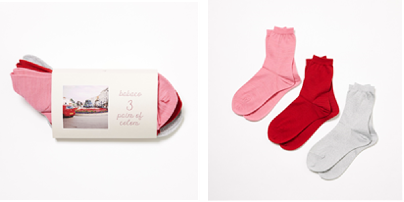 定番の3色セットのソックスを“LOVE,GRATITUDE”のテーマに合わせ、デザイナーがチョイスしたカラーで別注オーダーしました。ピンク、レッド、シルバーの気分の上がる3色は、秋冬定番のローファーや、今シーズントレンドのファーサンダルなど、コーディネートのワンポイントに。デザイナーが旅先のヨーロッパで撮影したパッケージの写真もポイントです。