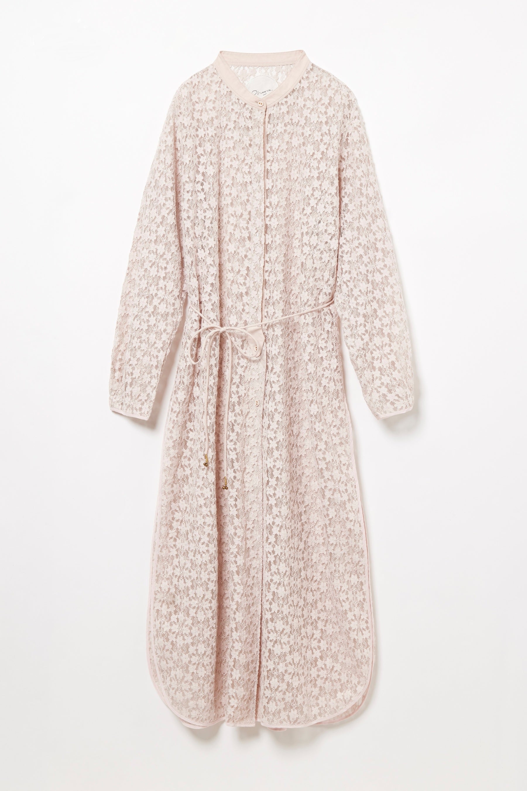 IRENEシリーズのレース生地を使用したワンピースを別注オーダーしました。ボタンで前開きできる仕様に加え、付属の細い紐を使ってウエストマークも可能で、アレンジ多彩な一着です。レースの透け感や、深めのスリットを入れた動きの出る軽やかなシルエットは、秋冬シーズンのニットとのレイヤードスタイルや、春夏シーズンの薄手の羽織として、一枚で何通りも着回しの効くアイテムです。