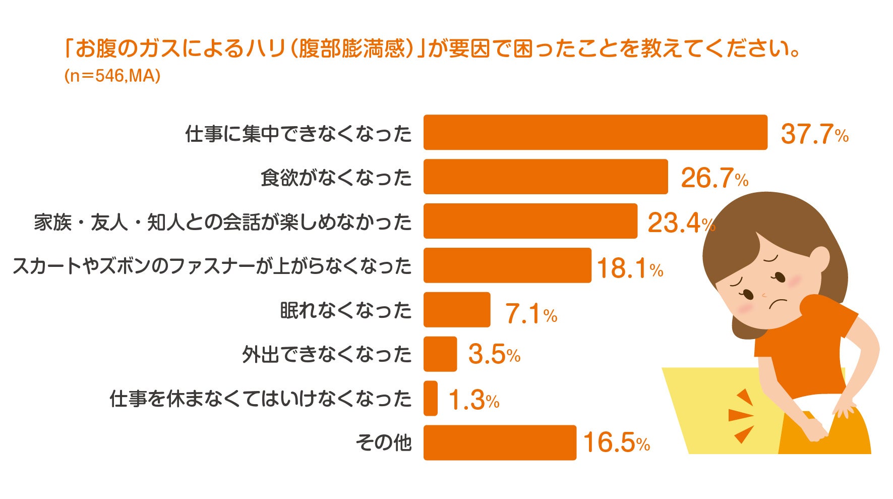 「お腹のガスによるハリ」で困ったことが「ある」と回答した人に、「お腹のガスによるハリ」が原因で困ったことを尋ねたところ、「仕事に集中できなくなった」(37.7%)、「食欲がなくなった」(26.7%)、「家族・友人・知人との会話が楽しめなかった」(23.4%)が上位となり、生活のさまざまな場面で困難があることがわかりました。