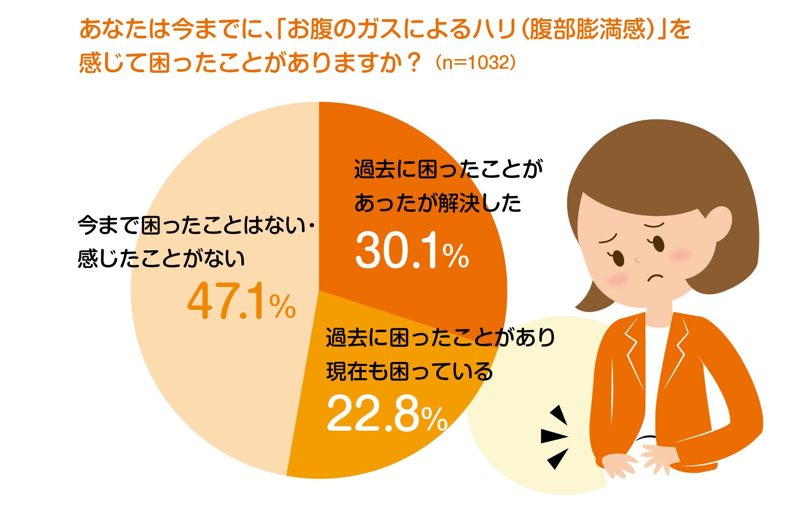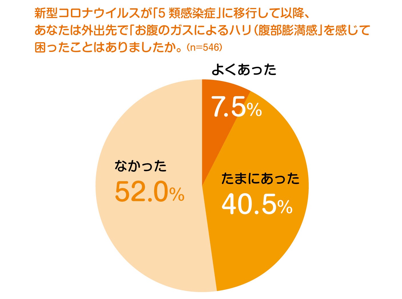 ■新型コロナウイルス5類移行で外出増、数か月の間でも「おなら」「お腹のガスによるハリ」に悩む人が多い