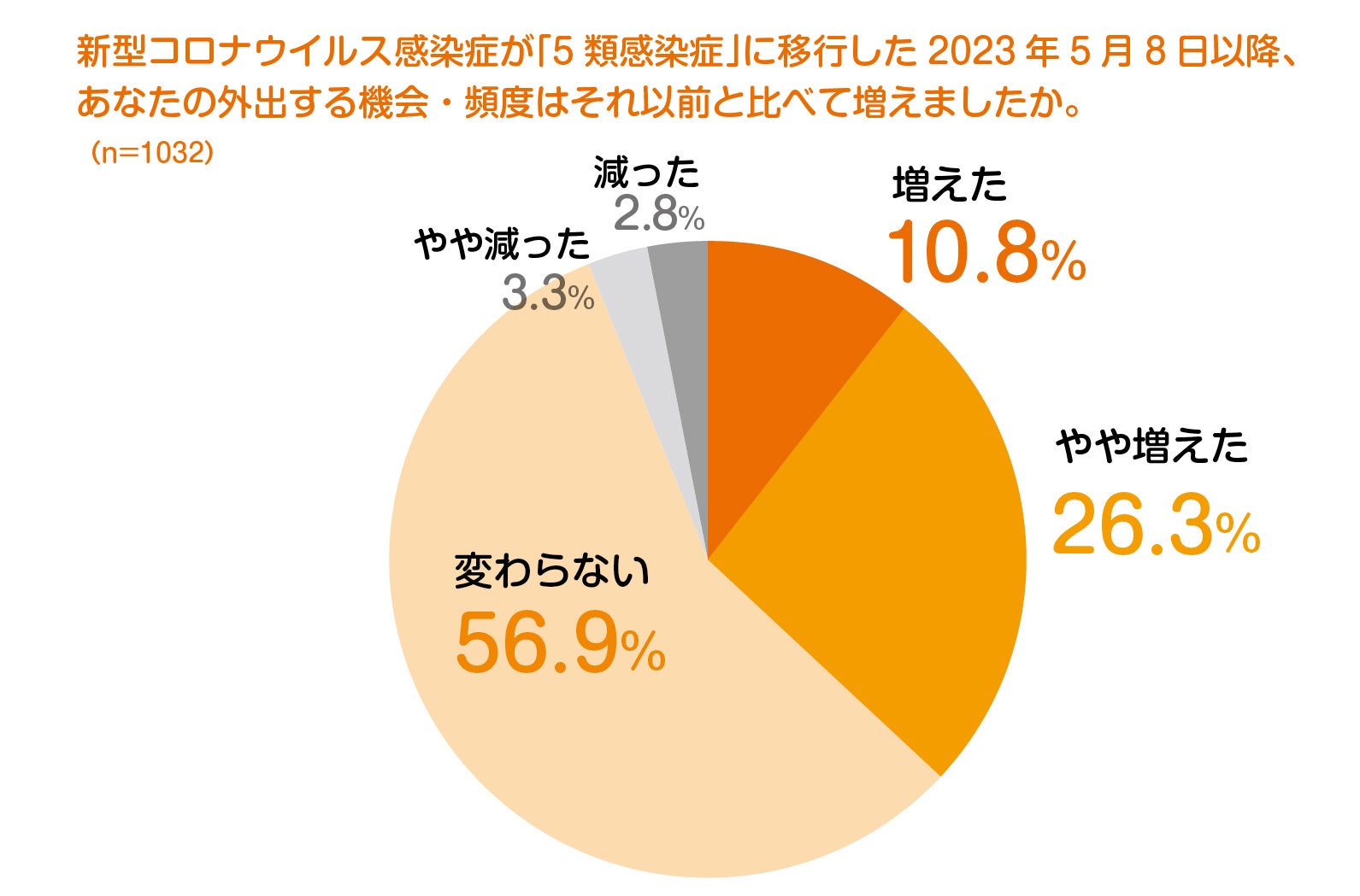 新型コロナウイルス感染症が「5類感染症」に移行した2023年5月8日以降の外出機会や頻度の変化を尋ねたところ、「変わらない」が56.9%と過半数を超えたものの、「増えた」(「増えた」と「やや増えた」の合計)という回答が37.1%となり、外出機会や頻度が増えている人も多いことがわかりました。