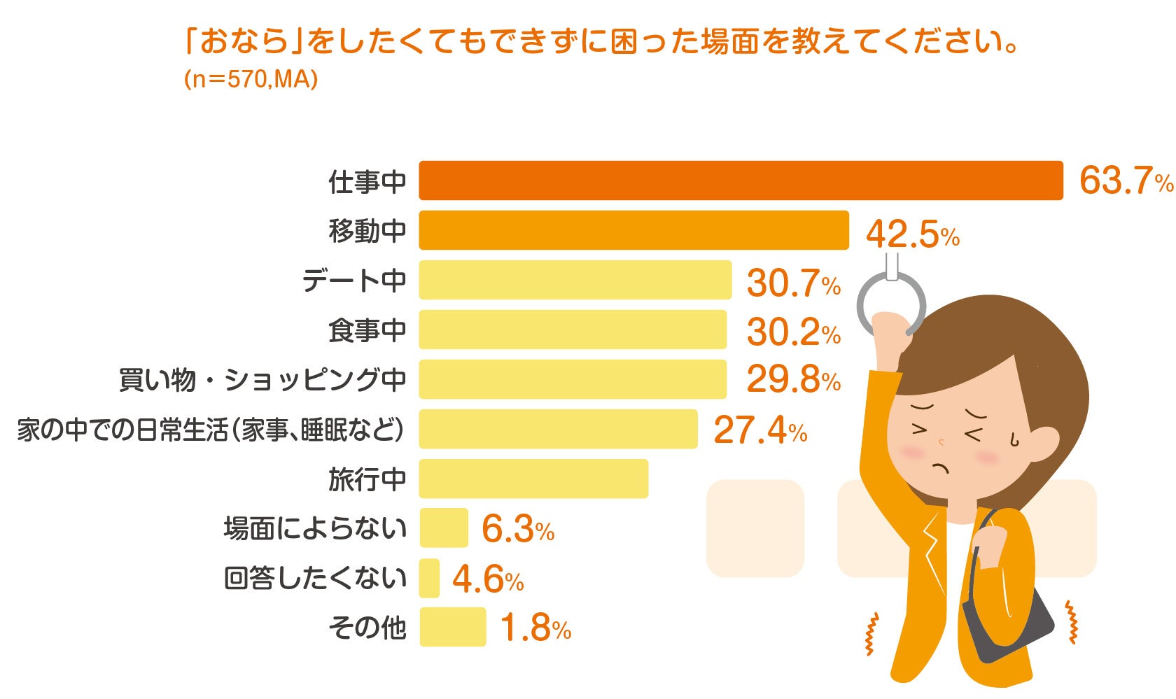 ・大切な会議の途中にお腹のガスによるハリを感じてトイレに行きたいような不快な気分になって会議に集中することができなかった。(50代女性)