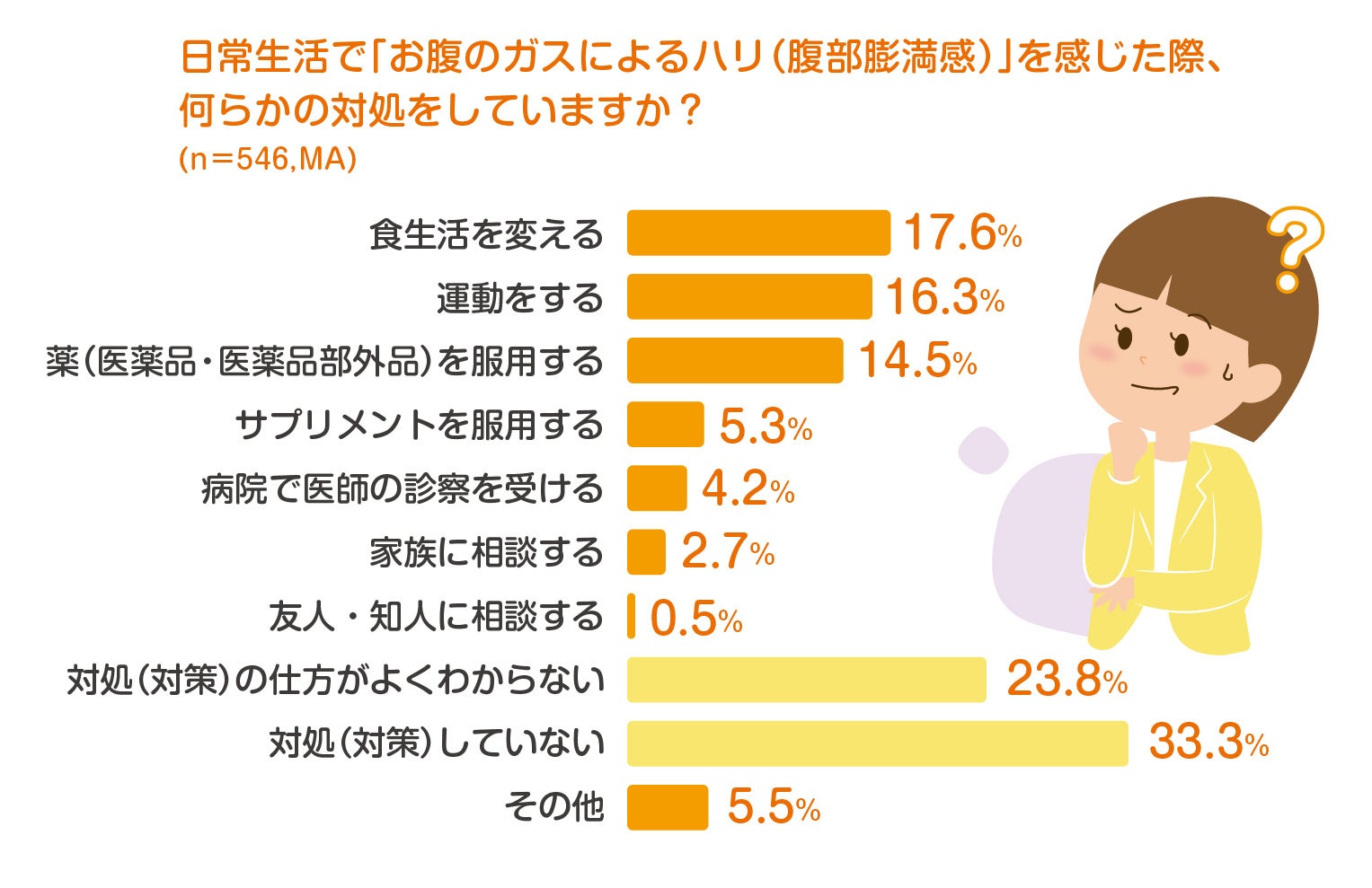 一方、「お腹のガスによるハリ」を感じたときに対処(対策)をしていることを尋ねると、「食生活を変える」(17.6%)、「運動をする」(16.3%)、「薬(医薬品・医薬部外品)を服薬する」(14.5%)への回答が多く寄せられました。「対処(対策)していない」(33.3%)「対処(対策)の仕方がよくわからない」(23.8%)の回答の割合も多く、悩みを抱えながらも適切に対処できずに困っている方もいるようです。また、家族や友人・知人に相談する人はほとんどおらず、適切な対処法が見つからず周囲が気づかぬうちに悩みを深めてしまうケースがあることもうかがえました。