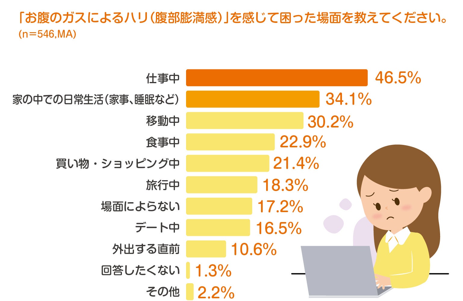 ■【場面別】実は「仕事中」におならや「お腹のガスによるハリ」に悩んでいる人が最も多い