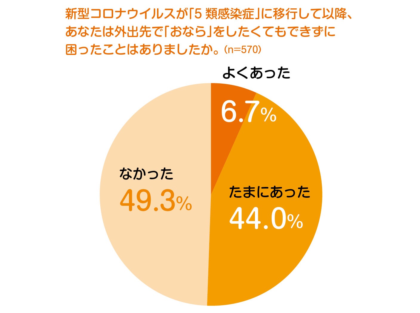 ・ 新型コロナウイルスの「5類」移行後に外出機会が増えた人は3割。直近でも外出先で「おなら」「お腹のハリ」に悩む人が約半数。