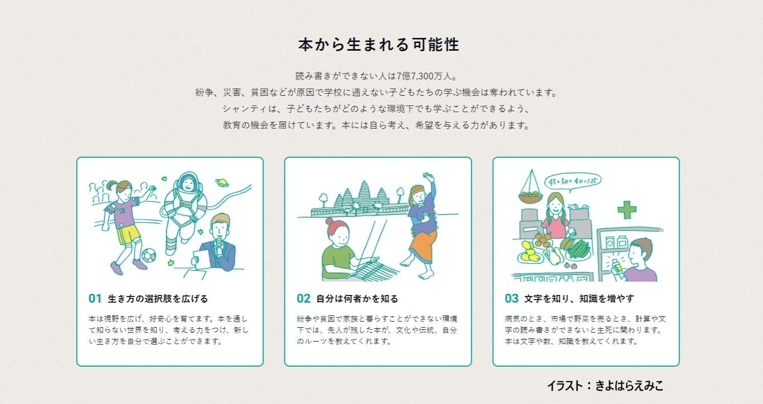 世界には、紛争や貧困、自然災害などで教育を受けられない人たちがたくさんいます。私たちは、厳しい環境の中でも安心して学べる機会をつくる活動を行っています。シャンティが目指すのは「ちがい」を「多様性」ととらえ、互いに認め合い、対話を通じて可能性を見つけることができる社会です。シャンティはこれからも本を通じて子どもたちに寄り添い、夢の実現に向けて進み続けます。