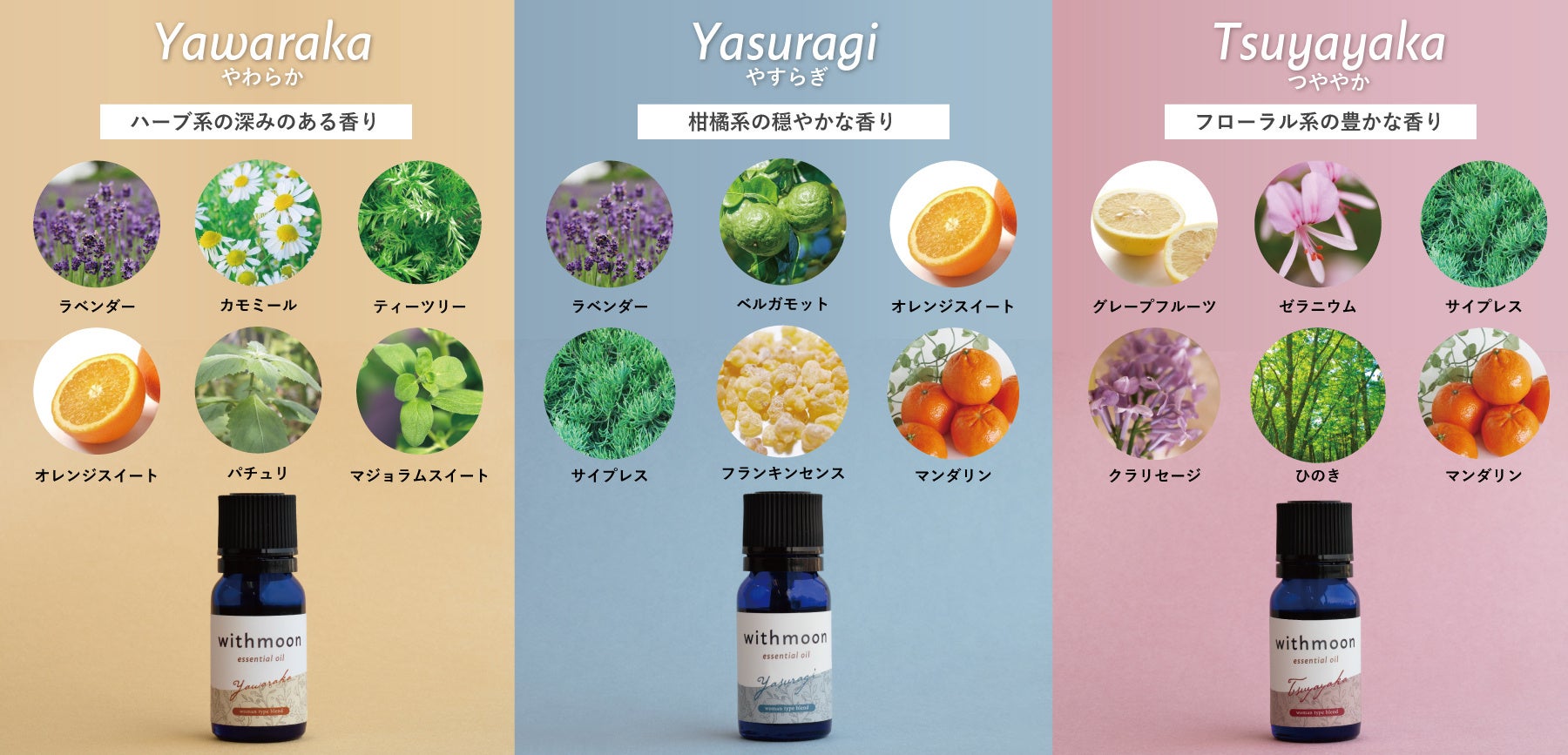 【商品名】withmoon エッセンシャルオイル Yawaraka/Yasuragi/Tsuyayaka(タイプ別ブレンド)