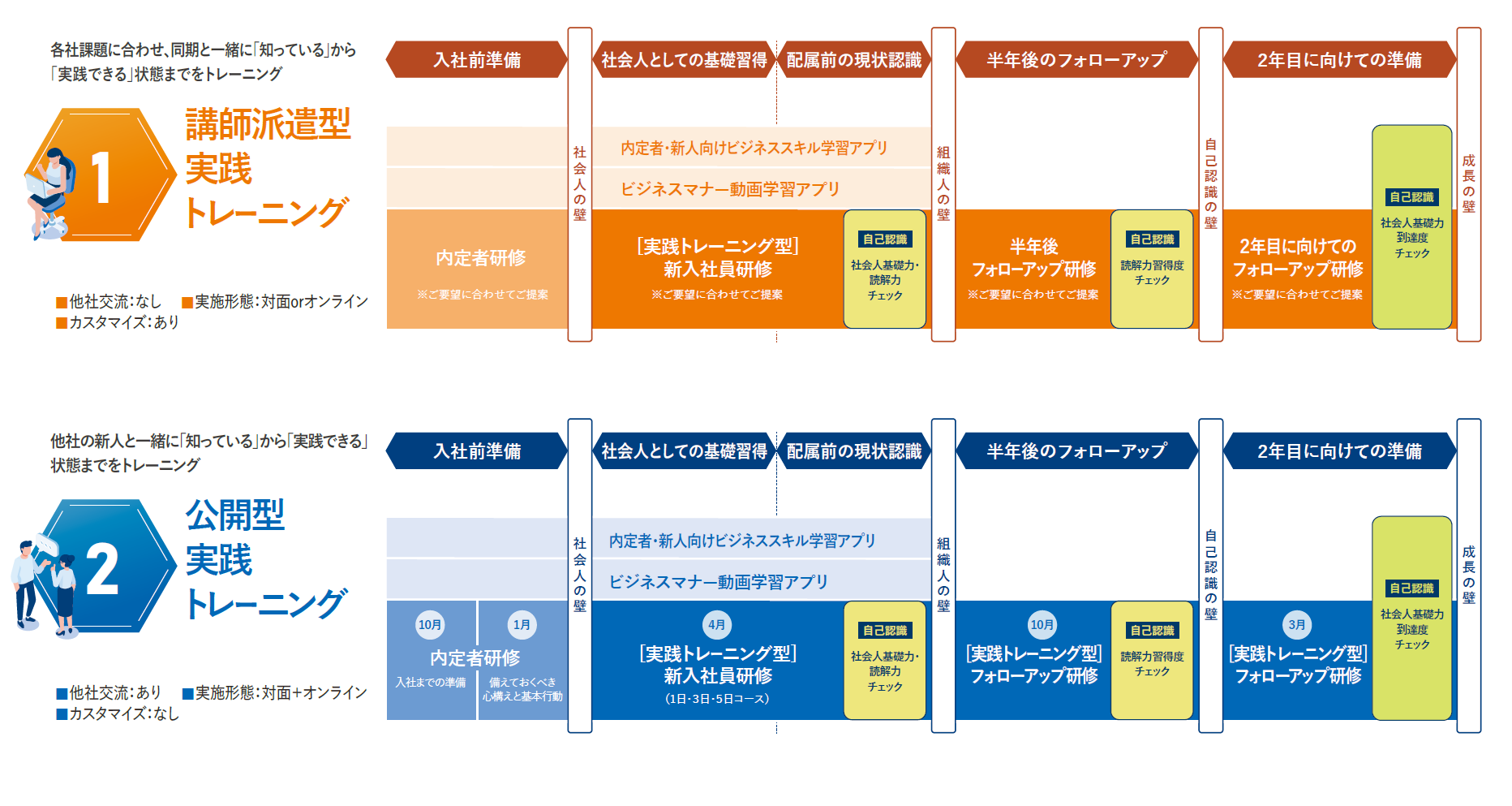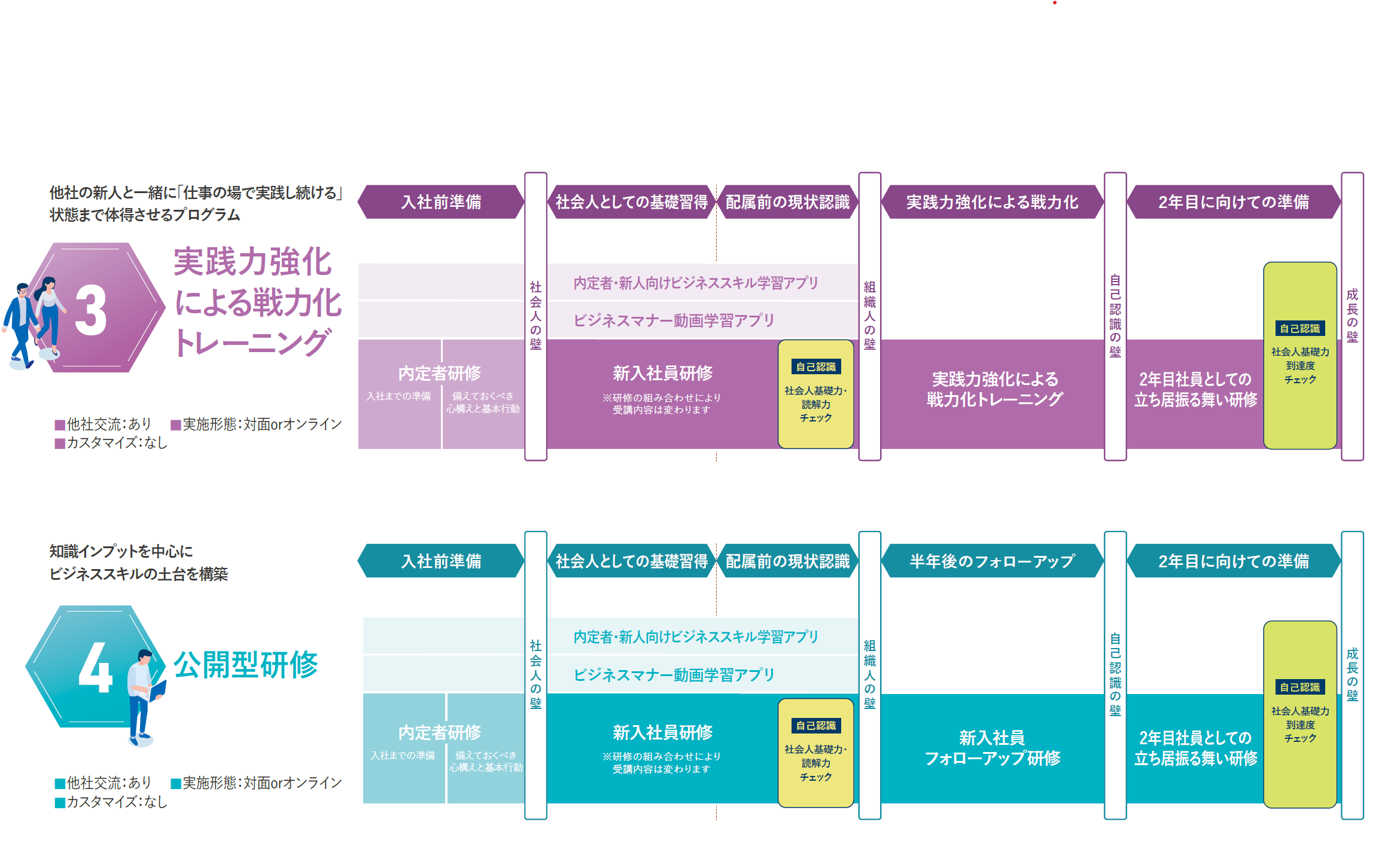 各社の課題や希望に合わせ、新入社員が4つの壁を乗り越えられるよう、以下の育成コースをご用意しております。