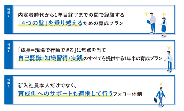 「ファーストキャリアコース」とは、新入社員の内定期間から1年目終了までの育成を様々な形でサポートするサービスです。LAが実施した大規模調査から明らかになった新入社員の特徴や実情を踏まえ、解決策を体系化。以下3つの特徴があります。