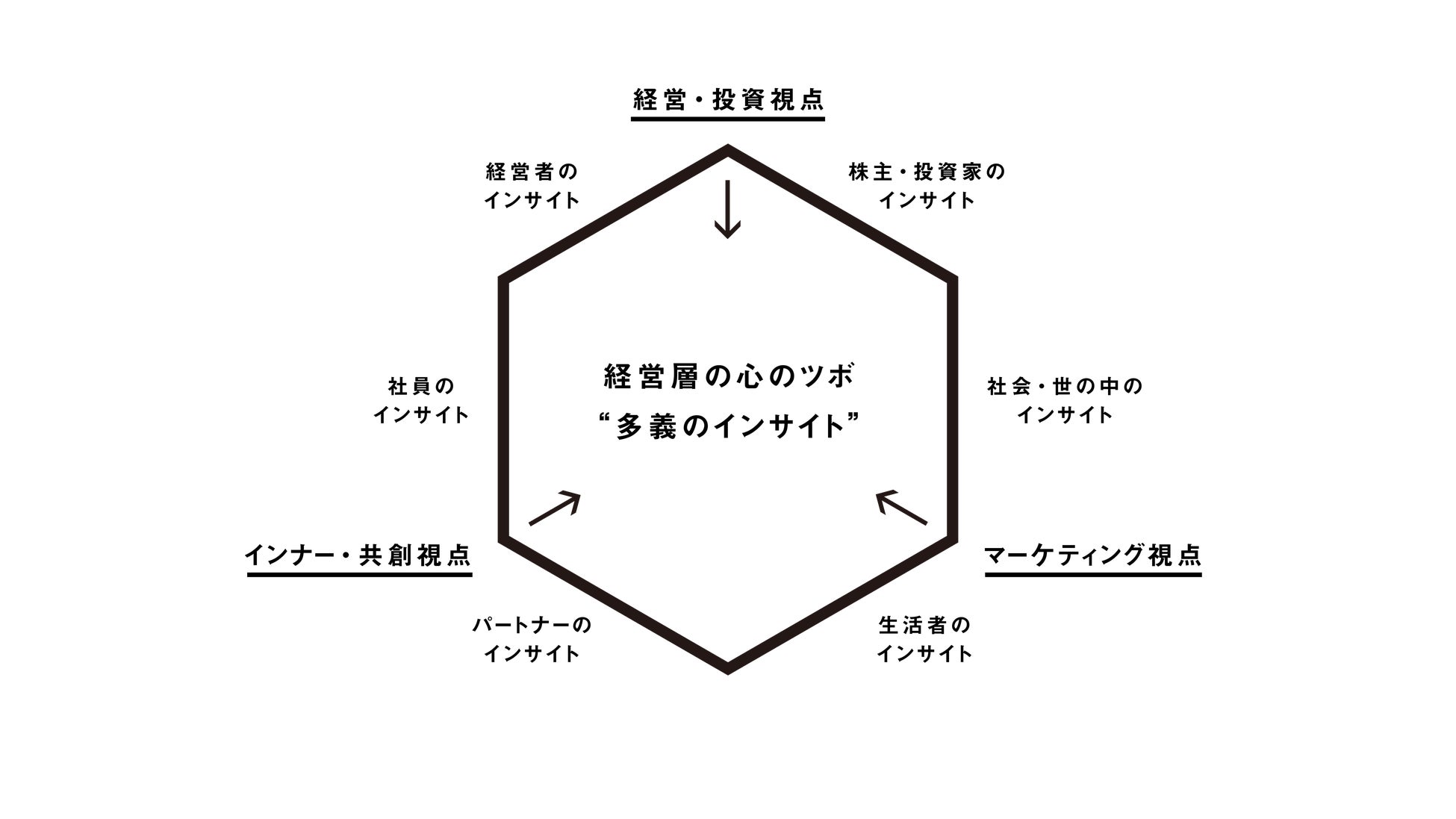 はじめに、多様なステークホルダーの様々なニーズ・インサイトを「経営・投資視点」「マーケティング視点」「インナー・共創視点」といった多角的・重層的視点で分析し、全てのインサイトを集約させた“多義のインサイト”を発見します。これを起点にした、持続可能な価値共創ストーリーを描くことで、全てのステークホルダーを、企業が向かうべき“ただ一つの視点”へと動機づけていくことが可能となります。