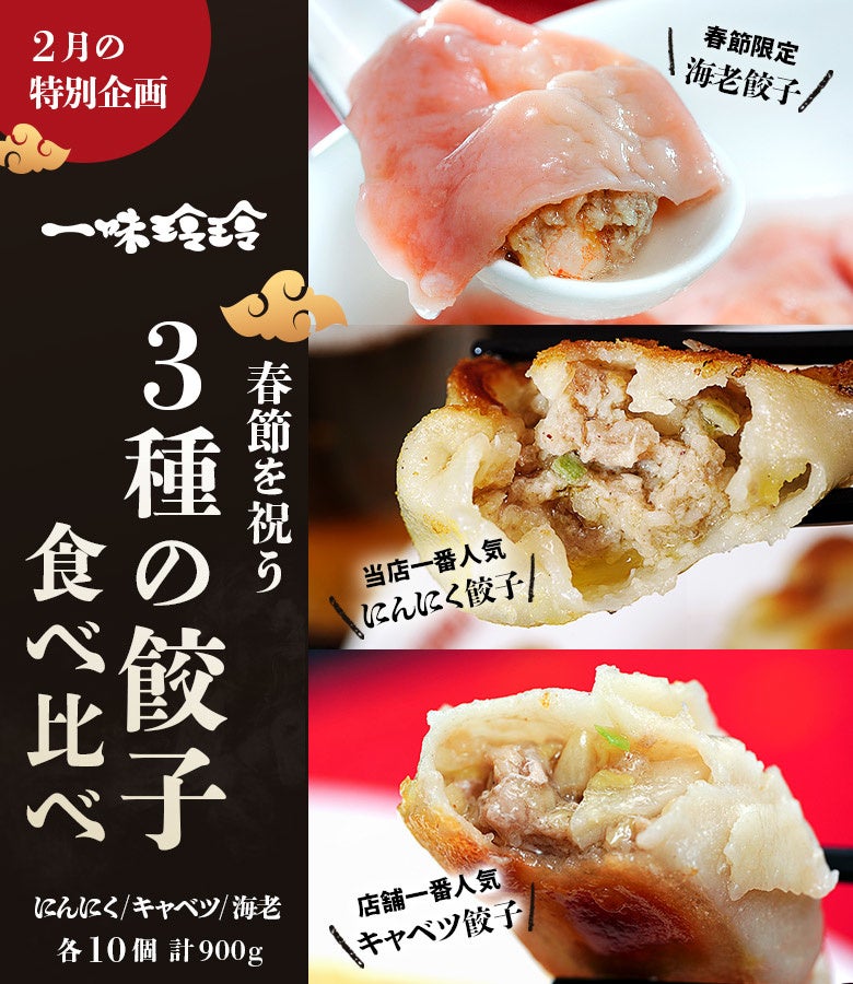 一味玲玲の3種の餃子食べ比べ「にんにく、キャベツ、海老餃子」