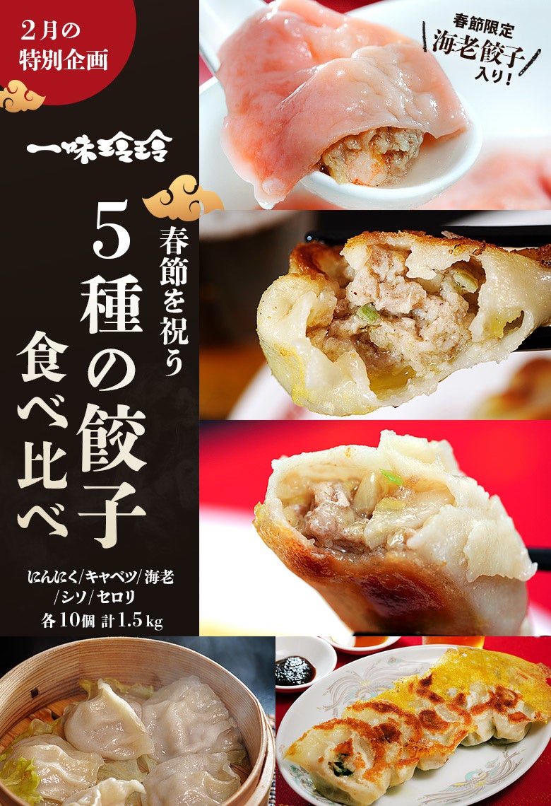 株式会社食文化が運営するECサイト「うまいもんドットコム」上で2022年2月、春節を祝う餃子食べ比べ3種(にんにく、キャベツ、海老)、5種(にんにく、キャベツ、海老、セロリ、シソ)のセット販売を始めました。素材の香りや味を生かした餃子をEC通販を通して全国の食卓に配送します。詳細はHP:https://www.umai-mon.com/user/collection/1366
