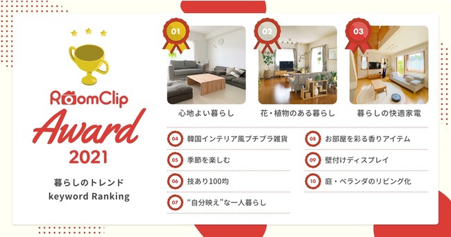 今年の住まい&暮らしのトレンドを分析!「RoomClip Award 2021」を発表〜今年の注目キーワード1位は「心地よい暮らし」で2.4倍増〜