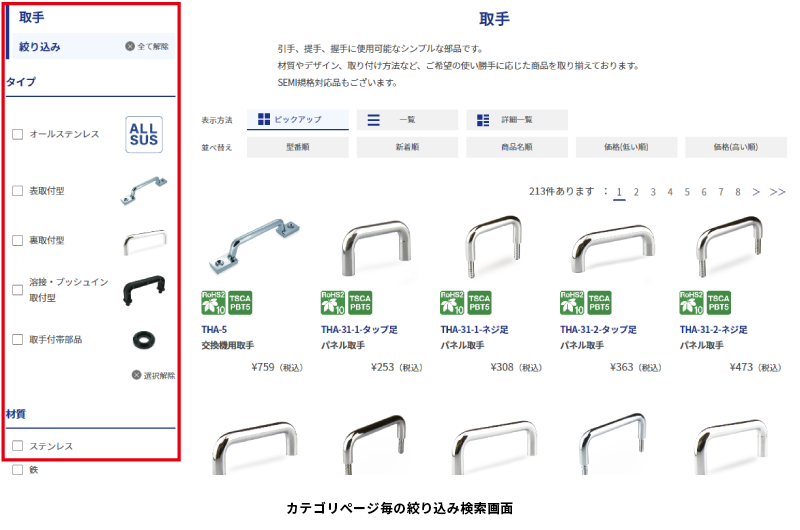 例えば、取手であれば「タイプ」「材質」「取手ピッチ」「高さ」「ねじ径」「垂直許容荷重」「型式」「色調」「SEMI規格」「適応機種」「難燃性」「機能」から商品を絞り込むことができます。