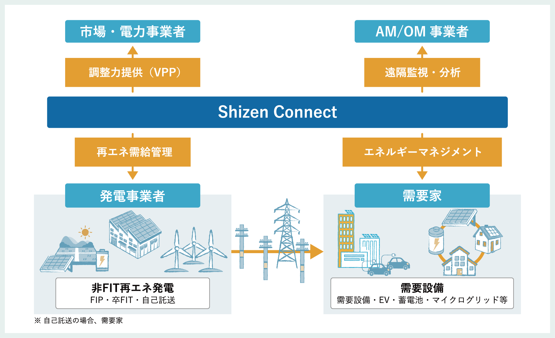 Shizen Connect(シゼンコネクト)は、再エネ発電や蓄電池・EV・EQなどのエネルギーリソースを集合的に制御するアグリゲーション・エネルギーマネジメントシステムです。住宅の太陽光発電と蓄電池、V2H機器などの制御から、複数の建物を自営線などで繋いだマイクログリッドの制御、数千台規模のエネルギーリソースによるVPP制御などが実現できます。これまで分断されがちな個別の制御とVPP制御などをワンストップで提供できるので、エネルギーリソースをマルチパーパスで利用することで経済性を向上させられ、またベンダーフリーなのでメーカー依存なくエネルギーリソースは自由に選定できます。