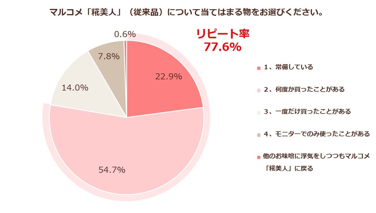 本テストマーケティングは、スナップディッシュユーザーの中で既存品の「糀美人」利用経験者200名を対象に実施しました。テストモニター参加者の82.1%が週3回以上みそを使っており、「糀美人」のリピート率は77.6%にのぼります。