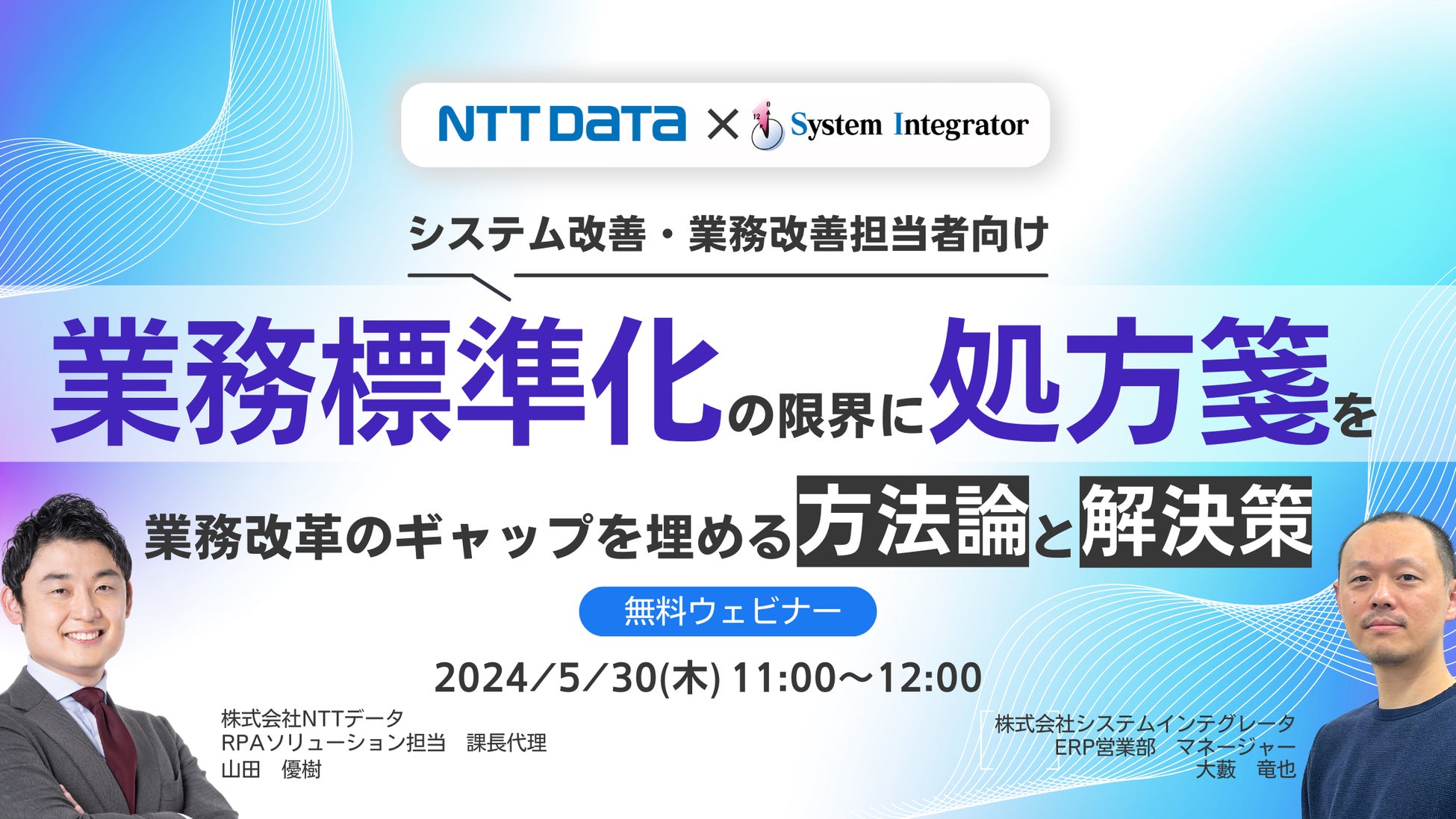 株式会社システムインテグレータ(本社:さいたま市中央区、代表取締役社長:引屋敷 智、東証スタンダード:証券コード3826)は、2024年5月30日(木)に無料ウェビナー 「業務標準化の限界に処方箋を!業務改革のギャップを埋めるための方法論と解決策」を株式会社NTTデータと開催することをお知らせします。