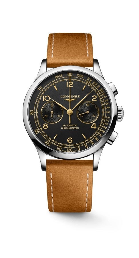 レコードの2022年の新作は、ロンジンの歴史的キャリバー13ZNクロノグラフにインスパイアされたプッシュピースを備えるクラシカルな外観を採用。レコードでは初となるタキメーターを採用した、クラシカルなスポーツテイストが光るデザイン。文字盤はゴールドの数字が転写されたマットブラックカラーにリーフ型の針をセットし、上品で落ち着いた印象を与えます。スポーティーかつクラシカルなデザインを合わせもつこの時計は、時計愛好家はもちろん、自分のスタイルを確立した大人にもぴったりの上級者向けアイテムです。ブラウンのレザーストラップまたはステンレススティールのブレスレットのラインアップです。