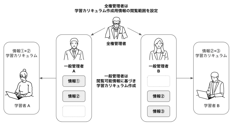 今回提供を開始する「Advancedプラン」では、学習カリキュラムを作成する管理者が「全権管理者」と「一般管理者」に分かれ、全権管理者は、一般管理者が閲覧・編集できる情報の範囲を設定できるようになります。一般管理者は、閲覧・編集権限が付与された範囲の中で学習カリキュラムが作成できます。