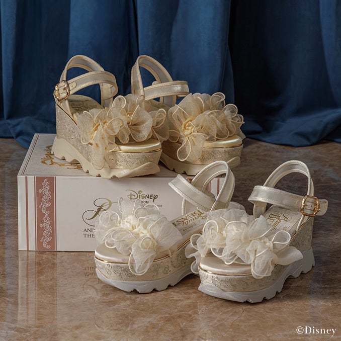 ローズモチーフをあしらったフリルデザインと程よい透け感のベルトが「ベル」のドレスを彷彿させます。ローズモチーフの刺繍をさり気なく施した厚底ヒールもポイントです。