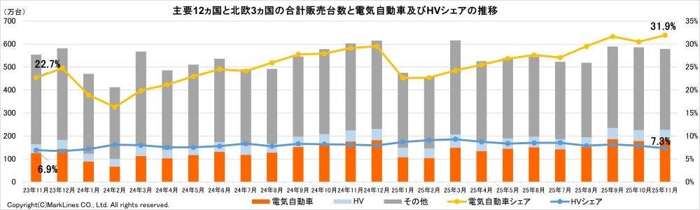 主要12カ国とノルウェー、スウェーデン、フィンランドの北欧3カ国(計15カ国)における11月の電気自動車販売台数は184.9万台だった。前月比3.5%増、前年同月比でも5.3%増だった。また、11月の電気自動車シェアは31.9%で、前月比で1.4ポイント増加、前年同月比でも2.8ポイント増加した。9月の31.6%を0.3ポイント上回り、市場シェアは過去最高となった。2025年1-11月の電気自動車累計販売台数は、前年同期比20.7%増の1,634.6万台で、自動車販売台数全体に占めるシェアは27.4%となった。
