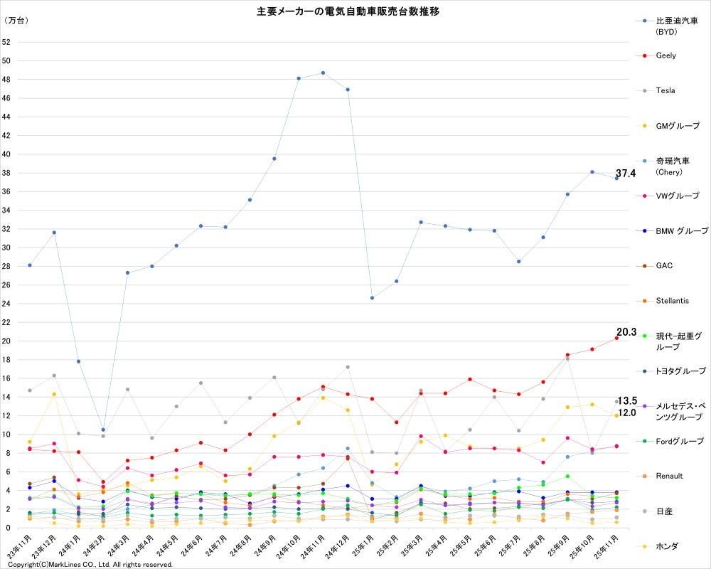 マークラインズ株式会社(本社:東京都港区、代表取締役社長:酒井 誠、http://www.marklines.com/) は、電気自動車の世界販売の約90%をカバーする主要15カ国を対象にグローバル市場における電気自動車の台数情報及び販売動向を分析した2025年11月の電気自動車(BEV/PHV/FCV)販売月報(商用車を除く、推計値を含む)を掲載しました。
