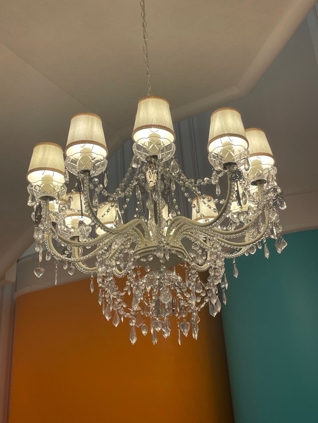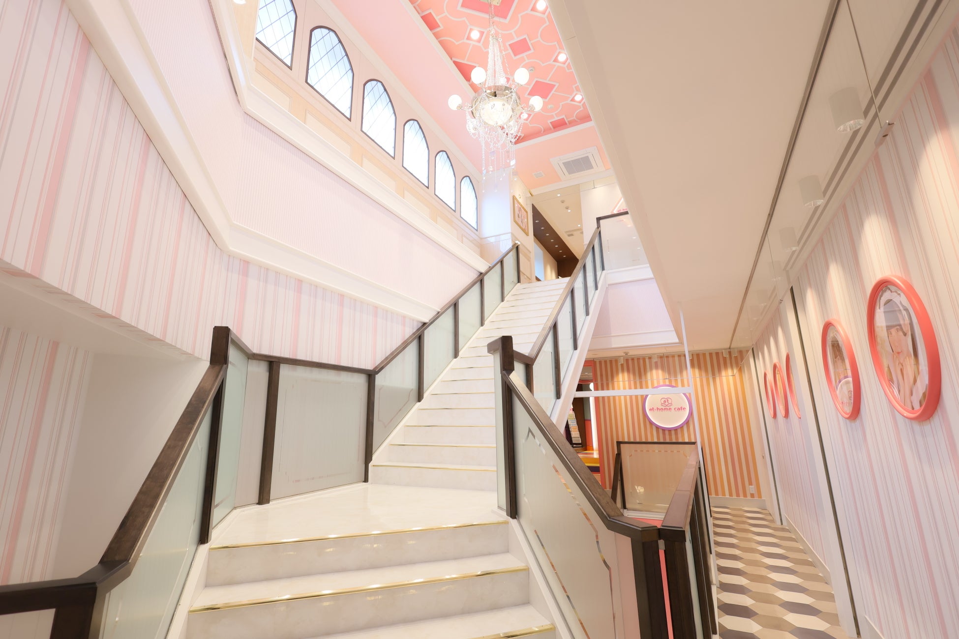 天井には、あっとほぉーむカフェのロゴや、秘密が隠されたオリジナルのシャンデリアも。ロビーにあるシャンデリアと、2階から3階に上がる階段のシャンデリアは異なるデザインになっており、空間により世界観が変わります。