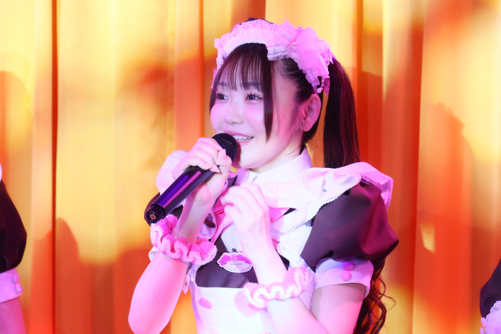 レジェンドメイドhitomi、スーパープレミアムメイドふわる、プレミアムメイドすぃ、ちあきゃんがステージでご挨拶とオリジナルソングを2曲披露しました。(開催は2階、3階ではステージの大きなスクリーンでの配信でご覧いただきました)