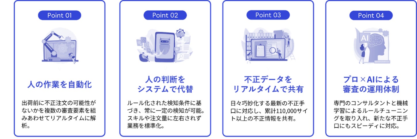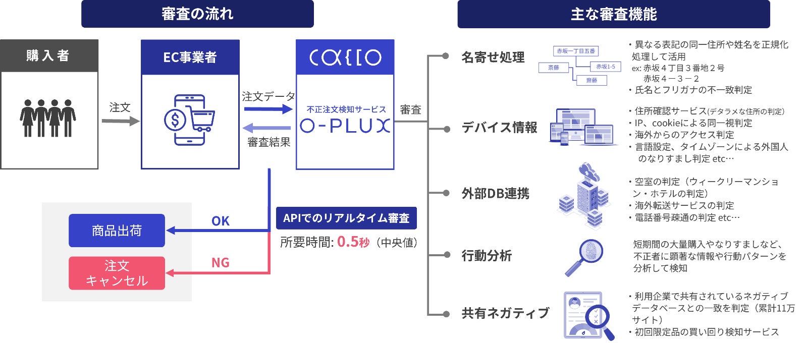 かっこが提供する不正注文検知サービス「O-PLUX」は、データサイエンスを活用した独自の審査ロジックにより、不正注文をリアルタイムに検知し、クレジットカードのなりすまし注文、不正転売・悪質転売、後払い未払い等の不正被害の防止及び審査業務の自動化を実現するクラウドサービスです。