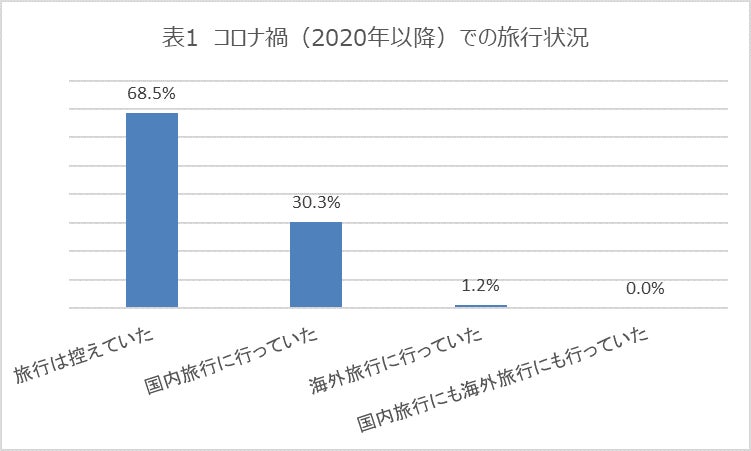 コロナ禍中(2020年以降)は68.5%が国内・海外ともに旅行を控え、またコロナ5類移行をきっかけに72.5%の人が旅行を再開したいとしながらも、実際に旅行を計画している人は33.9%(日帰り旅行を除く)に留まる結果となりました。まだまだ旅行を控えている人が多い傾向です。(*表1・2・3参照)