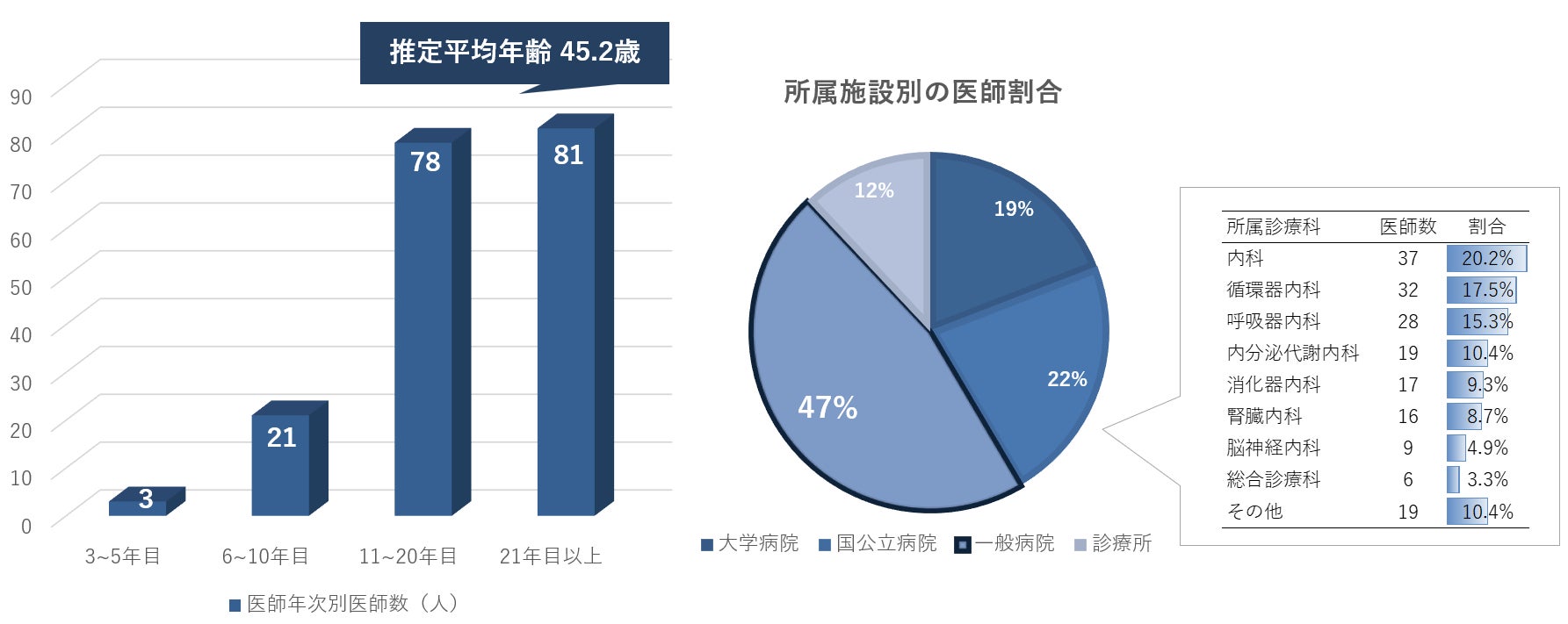一般病院の勤務医が最も多く47%(85人)、診療科は内科・循環器内科・呼吸器内科の医師が多い傾向。