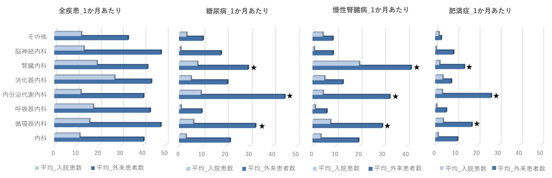 医師の所属診療科別に1か月あたりの平均診療患者数を見ると、糖尿病・慢性腎臓病・肥満症ともに内分泌代謝内科、腎臓内科、循環器内科の医師が多くの患者を診療していました。