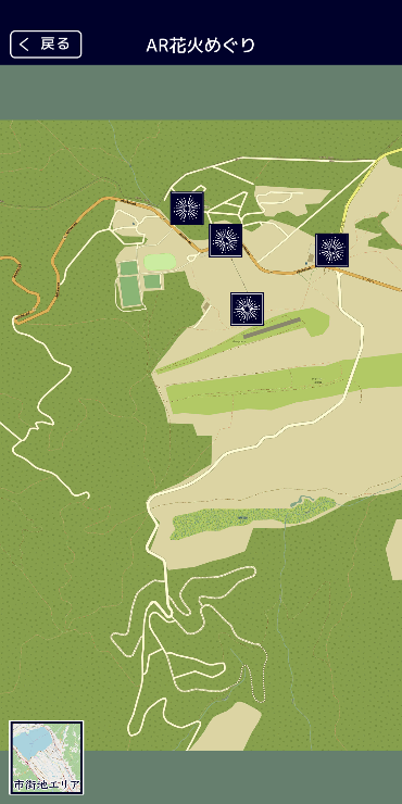市内に設定された花火スポットでアプリを起動させると【連続花火】、【尺玉花火】、【ハート型花火】をお好きなタイミングでスマホ上に打ち上げることが出来ます。また、好きなタイミングで花火を止めて写真を撮ることが可能です。