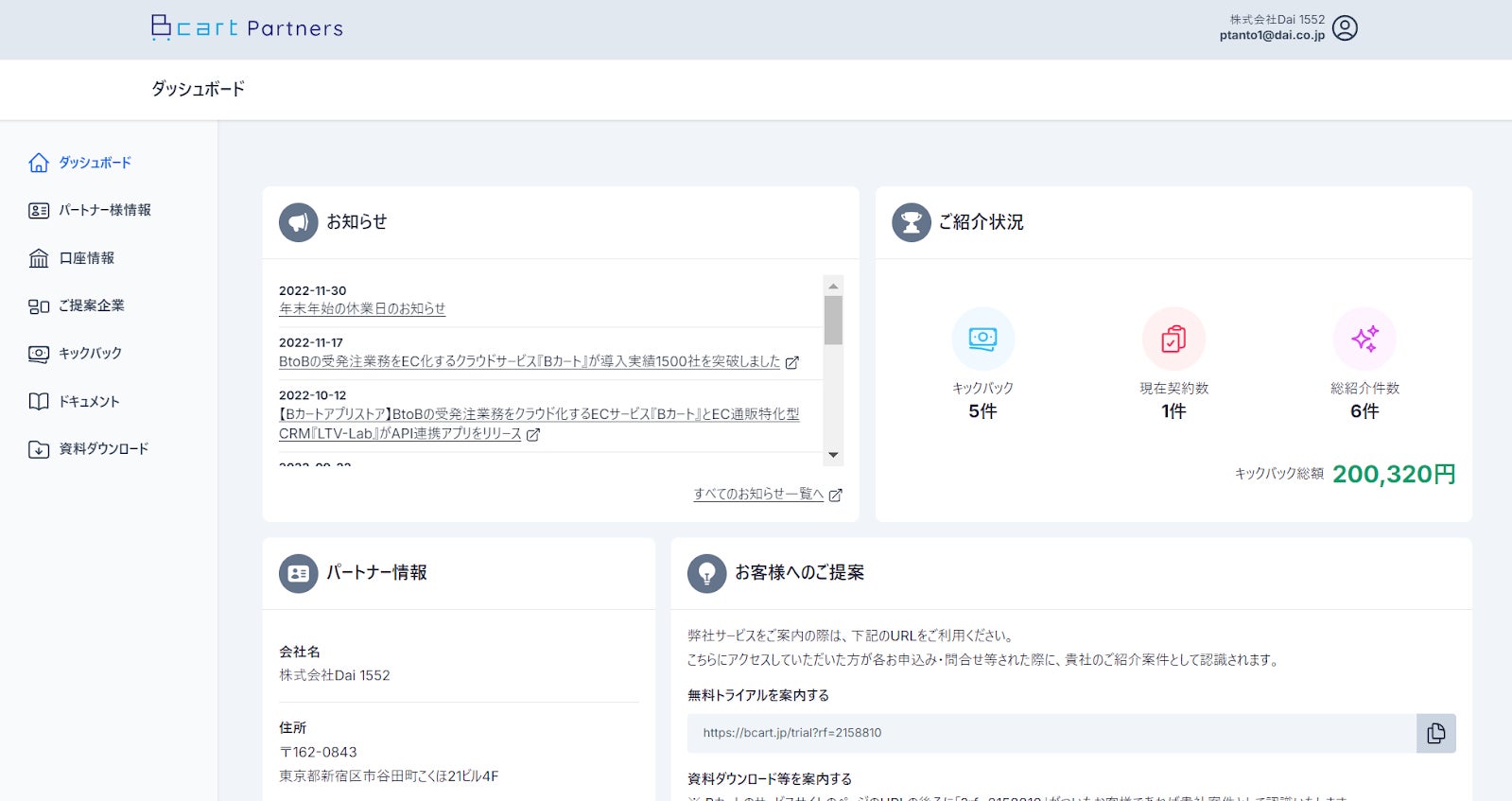 Bカートパートナープログラムに登録することで、Bカートの提案をすすめるための学習コンテンツや提案用のデモ環境へのアクセスができるようになり、提案案件が成約に至った場合は代理店手数料の獲得も可能となります。