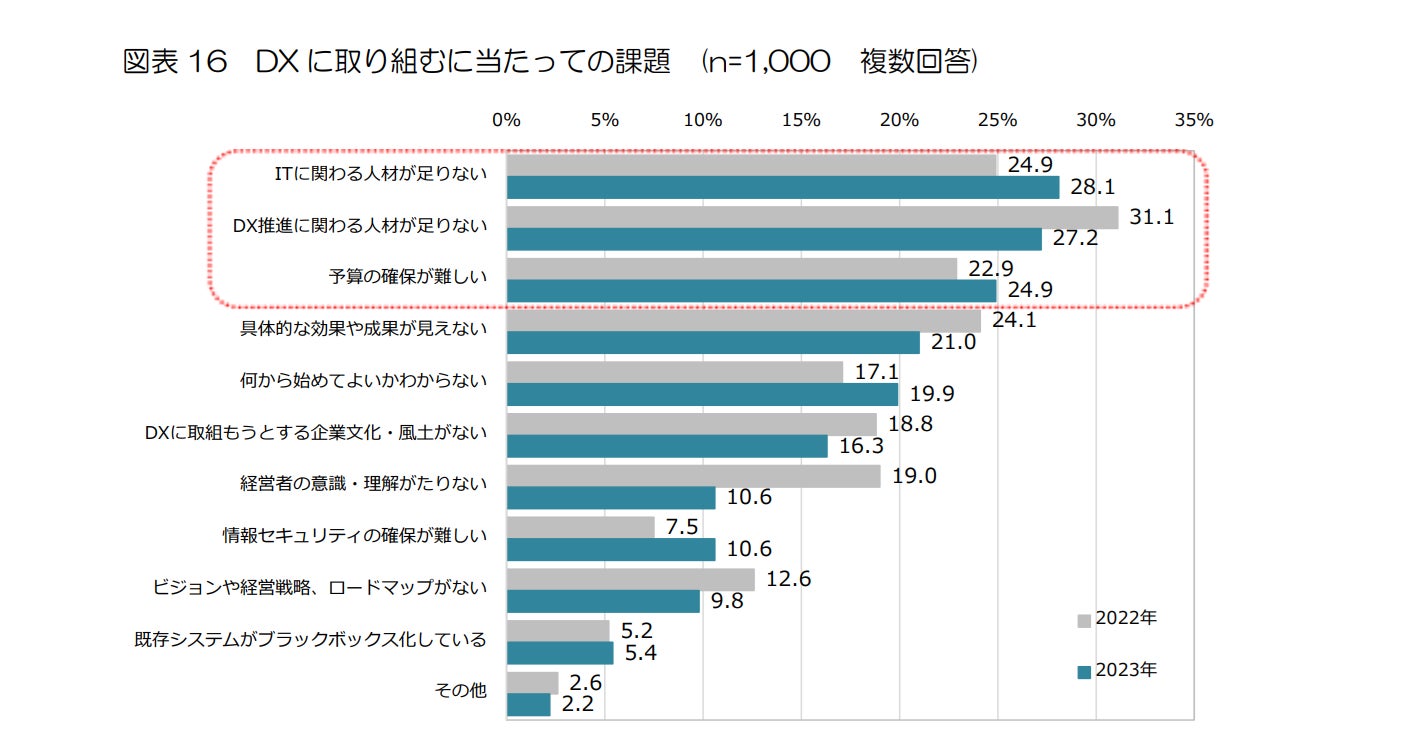中小企業がDXに取り組むにあたっての課題として「ITやDXにかかわる人材が足りない」というデータがあります(※)。このITやDXにかかわる人材をになう部分として、Web制作会社やITコンサルティング企業が存在し、Bカートの導入支援を通して中小企業のDXをサポートします。