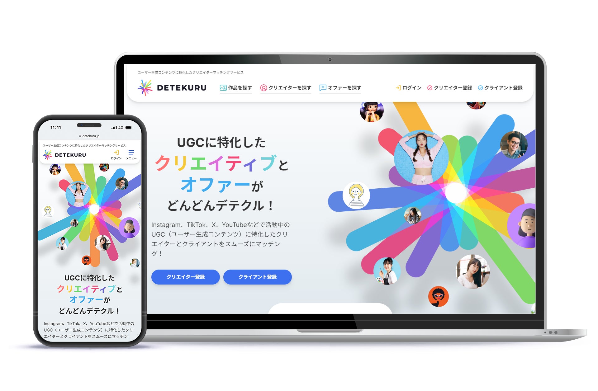 「DETEKURU」は動画制作、写真撮影、デザイン、イラスト・漫画、テキストライティング、音声・作曲など、SNSに特化した各ジャンルごとのUGCクリエイターとクライアントをスムーズに繋ぐマッチングサービスです。