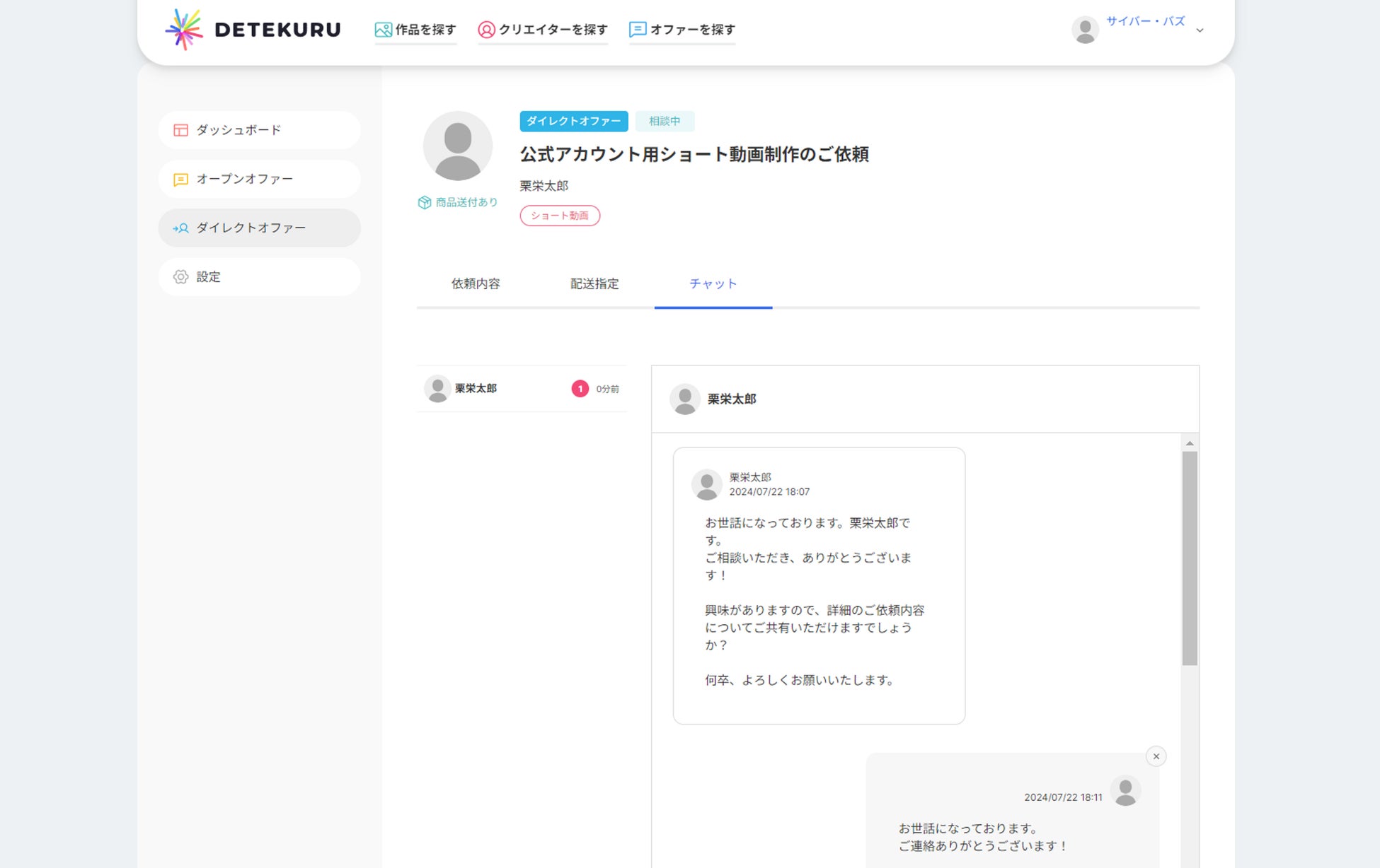 従来、企業がクリエイターを起用する際には、DETEKURU内で公開オファーを立て、応募があったクリエイターの中から条件に合うクリエイターを選定し、マッチングを行う「オープンオファー」形式を採用しておりました。この度、「オープンオファー」形式に加え、「ダイレクトオファー」機能をリリースし、DETEKURU内で直接チャットにて好きなクリエイターへオファーを行うことが可能となりました。